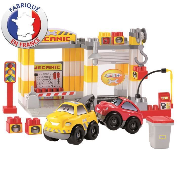 Ecoiffier - Mécanique Fast Car - Garçon - Un garage a construire avec pont tournant, pompe a essence, barriere inclinable, et deux véhicules a construire aux châssis et aux carrosseries interchangeables. En tout 70 accessoires. Fabrication Française - A partir de 18 mois - Livré a l'unité