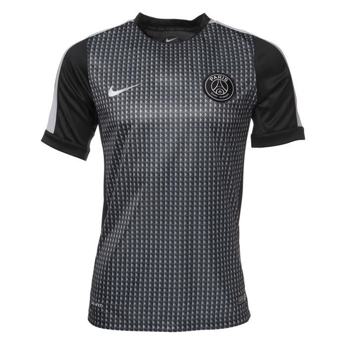 Maillot d'entrainement 100% polyester, noir et gris, col arrondi, logo PSG. Manches courtes.