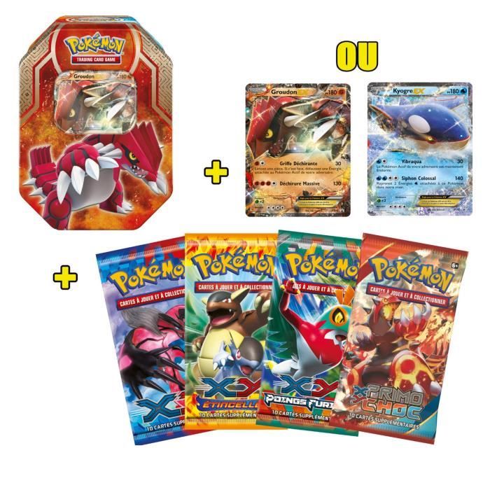 Boîte métal a collectionner avec 1 carte promo a l'effigie d'un Pokémon star du bloc XY (Groudon-Ex ou Kiogre-Ex) et un panachage de 4 boosters issus de la derniere nouveauté et d'anciennes séries Pokémon. Modele Pokébox Rouge - Garçon - 6 ans - Livré a l'unité