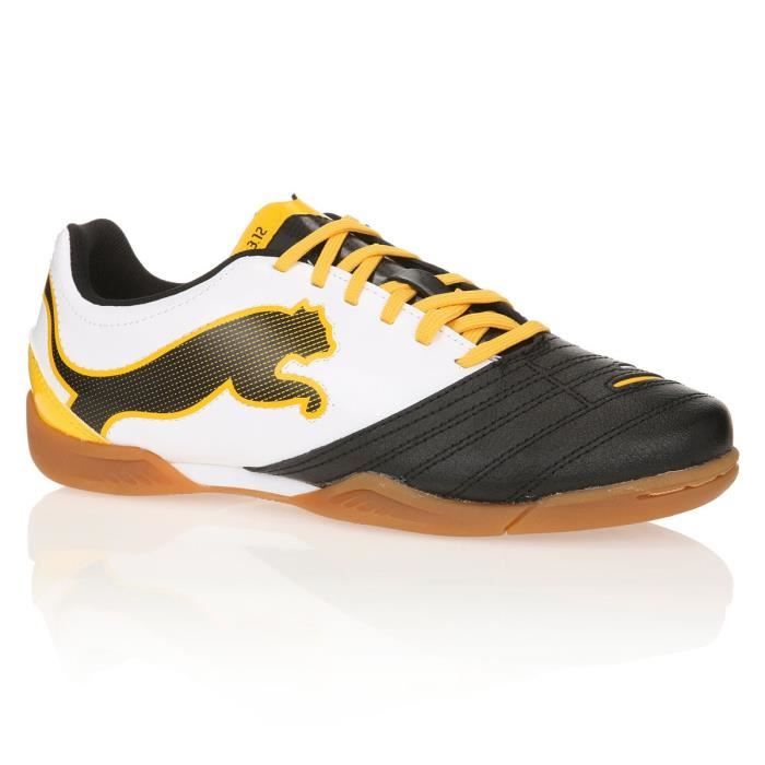 Chaussures de football avec tige en synthétique, noir et blanc, semelle intérieure en textile, semelle extérieure en caoutchouc pour terrains indoors. Fermeture par lacets.