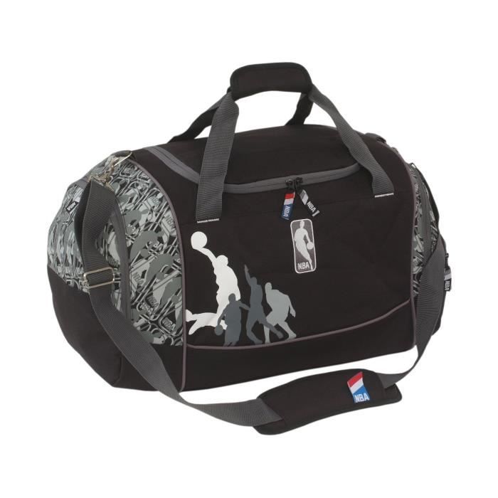 Sac de sport noir, 100% polyester, compartiment principal zippé, 2 poches latérales. Poignées de transport et bandouliere réglable.