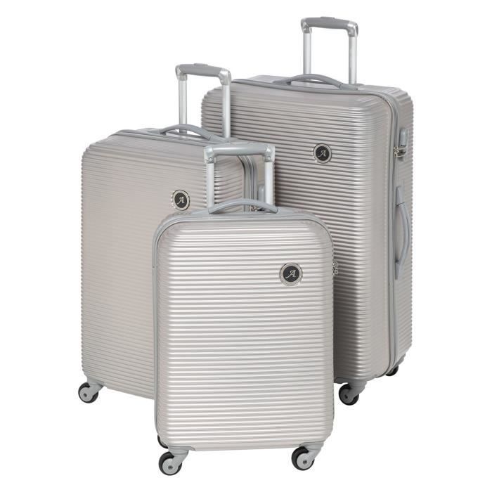 Set de 3 valises trolley 4 roues en ABS champagne. 3 formats : cabine, intermédiaire et maxi 48/60/70 cm. Syst?me trolley avec bouton poussoir ajustable en hauteur. Poignées de portage latérale et supérieure. Ouverture zippée ? double curseur + cadenas ? combinaison intégré. Deux compartiments dont un zippé.