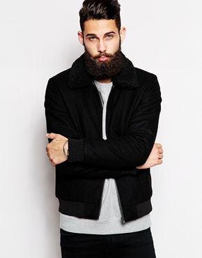 • ASOS - Blouson Harrington en laine avec col en fausse peau de mouton - Noir