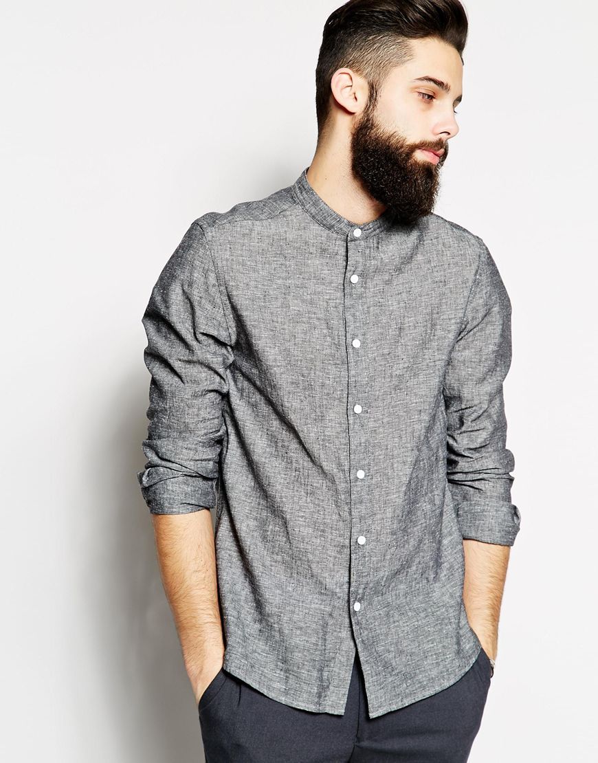 • ASOS - Chemise en lin mĂ©langĂ© Ă  manches longues et col grand-père - Gris