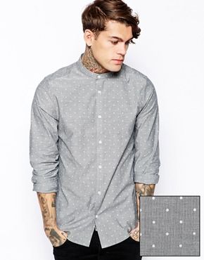 • ASOS - Chemise habillée à manches longues avec pois en chambray et col grand-père - Gris