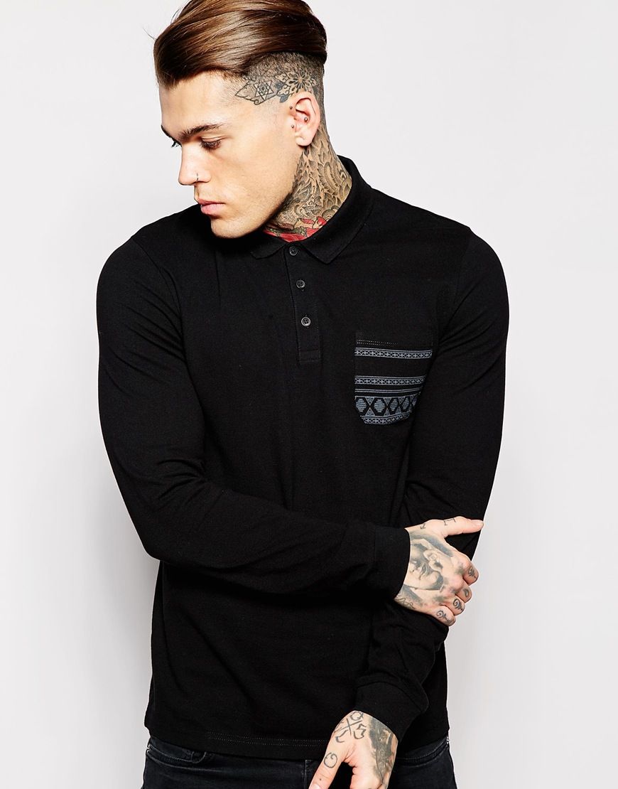 • ASOS - Polo à manches longues et poche à imprimé contrastant - Noir