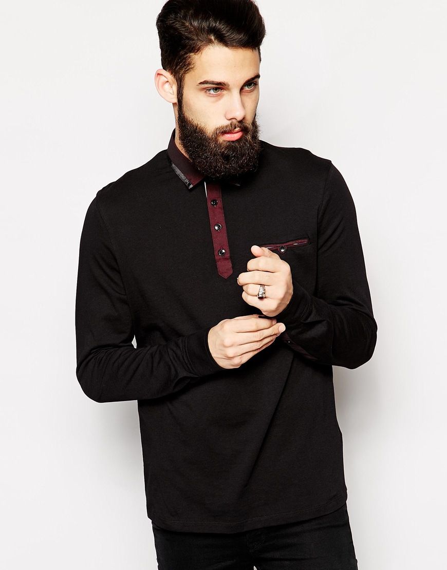 ASOS - Polo habillé à manches longues avec col contrastant et poche poitrine - Noir