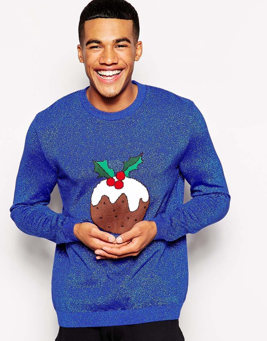 • ASOS - Pull de Noël motif pudding en maille métallisée - Bleu