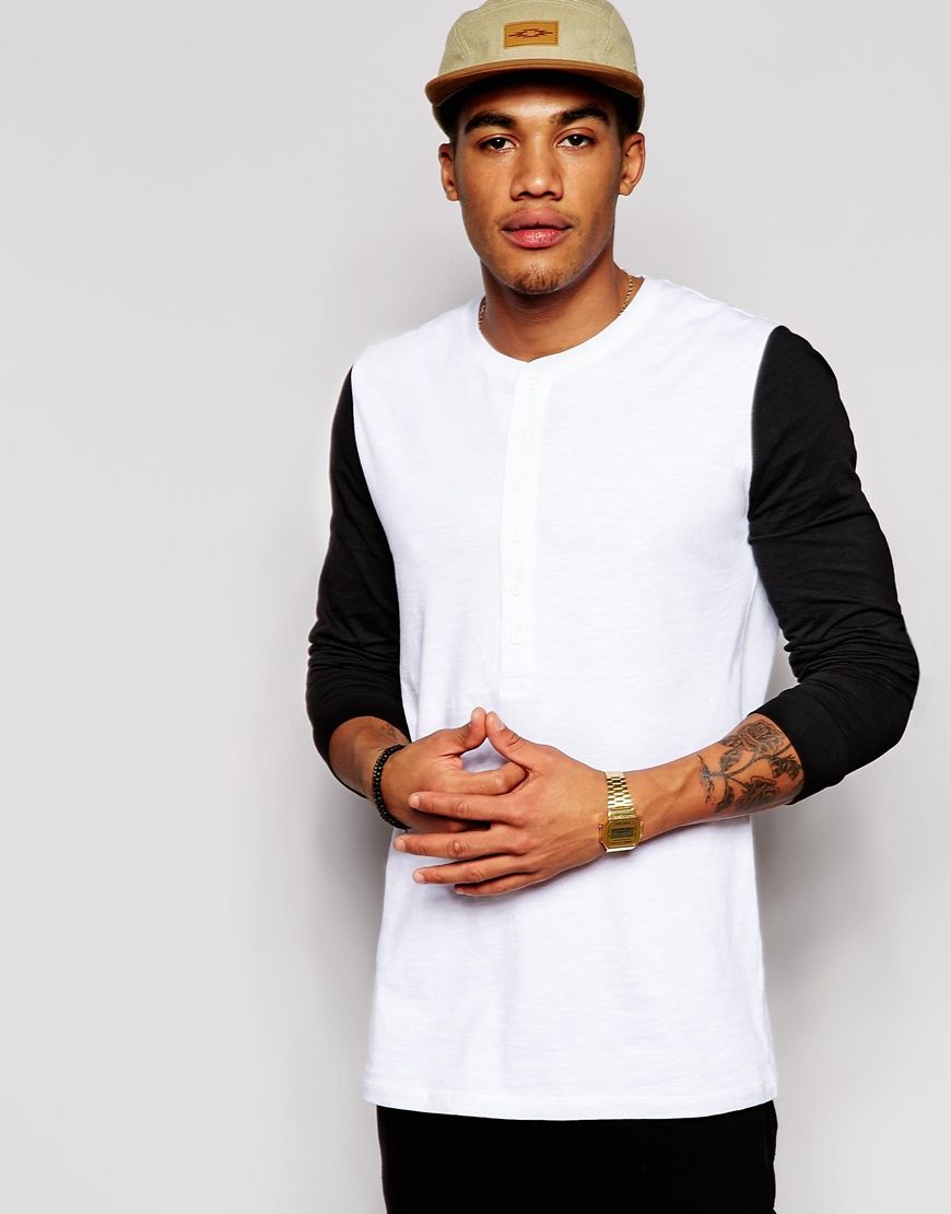 • ASOS - T-shirt en tissu flammĂ© Ă  manches longues contrastĂ©es et col grand-père