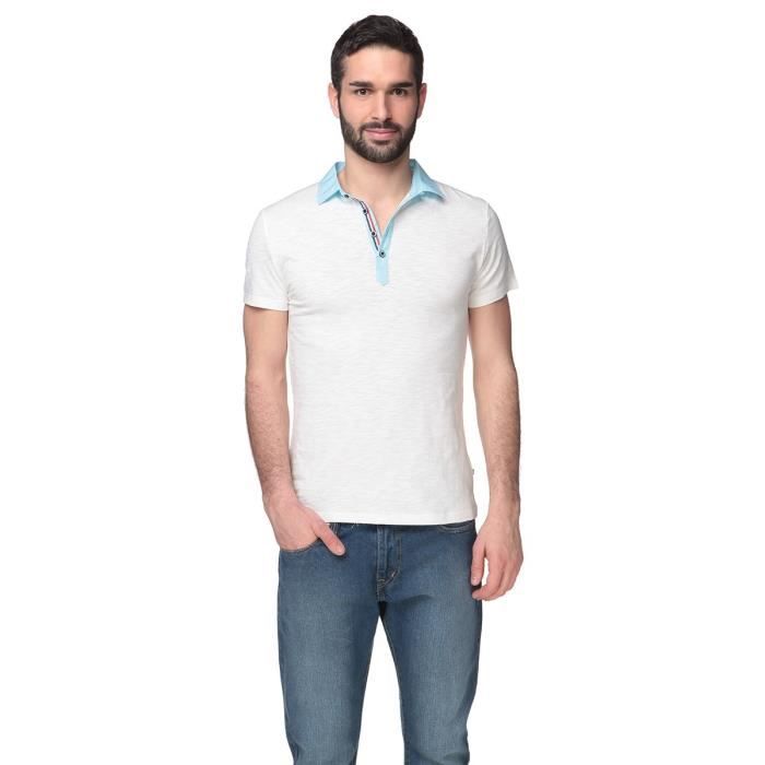 Polo 95% coton, 5% élasthanne blanc et bleu. Coupe ajustée.