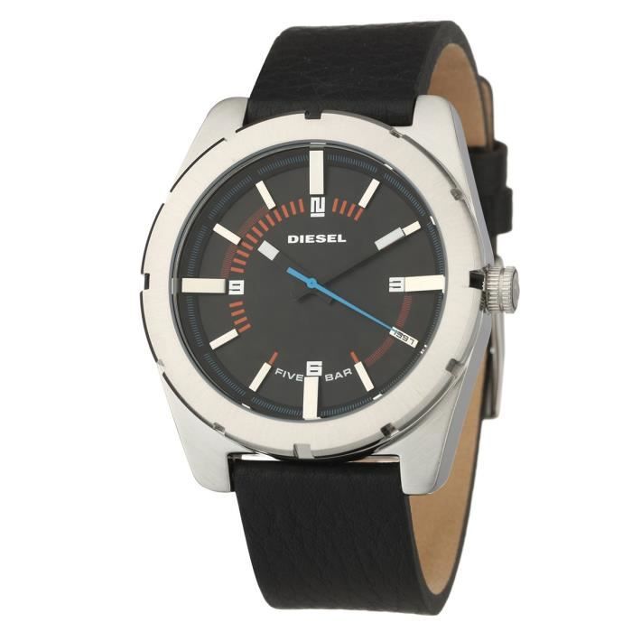 Montre en acier sur un bracelet en cuir noir. Cadran noir et orange, affichage analogique. Mouvement quartz. Montre résistant a une pression de 5 Atm
