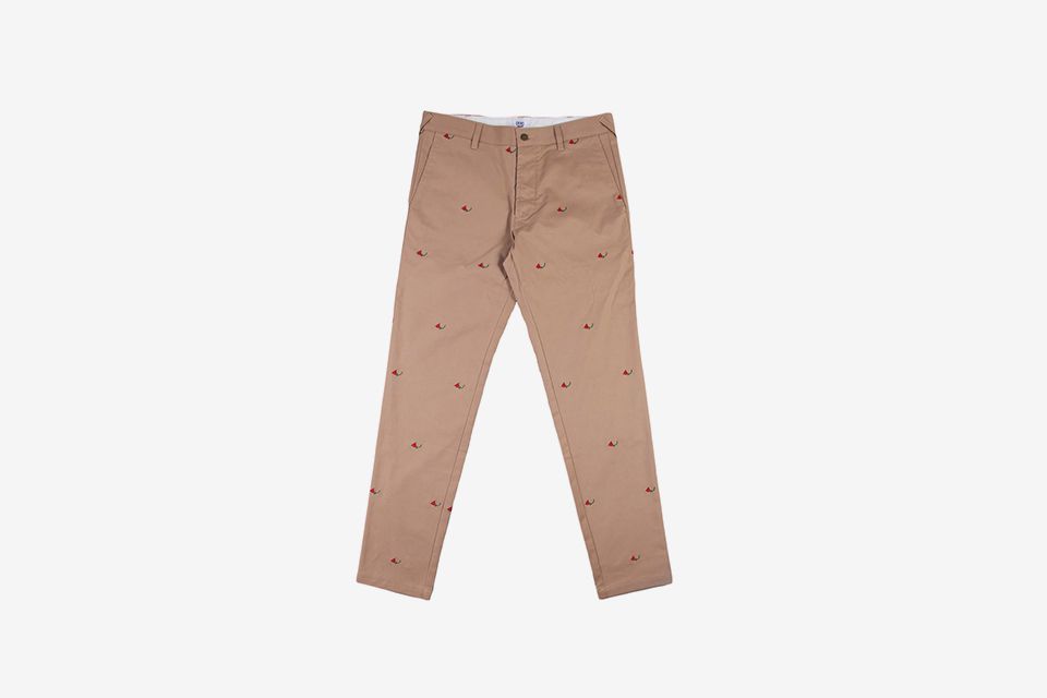 Repeat embroidery. Tapered hem. Brass buttons. Rear pocket label.