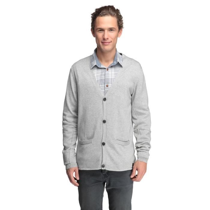 Gilet Gris Perle 60% Coton et 40% Viscoss a Manches Longues. Fermeture boutonnée, Col V large. 2 poches simples.