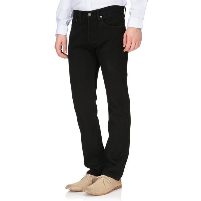 Noir, denim, 100 % coton, boutons. Jean 5 poches. Coupe droite au niveau de la taille avec une ouverture de jambe légerement fuselée.
