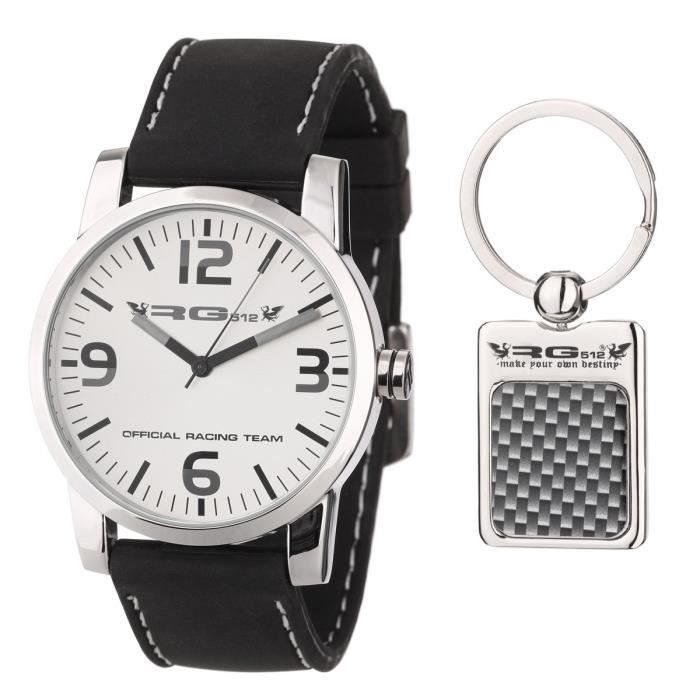 Coffret comprenant une montre et un porte clé en métal argenté. Montre en métal sur un bracelet en résine de coloris noir. Cadran blanc, doté d'un affichage analogique. Mouvement quartz. Montre résistant a une pression de 5 Atm.