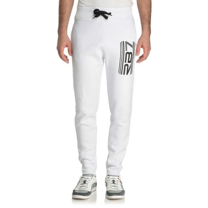 Jogging 65% coton, 35% polyester, blanc, taille élastiquée avec cordons de serrage, 2 poches.