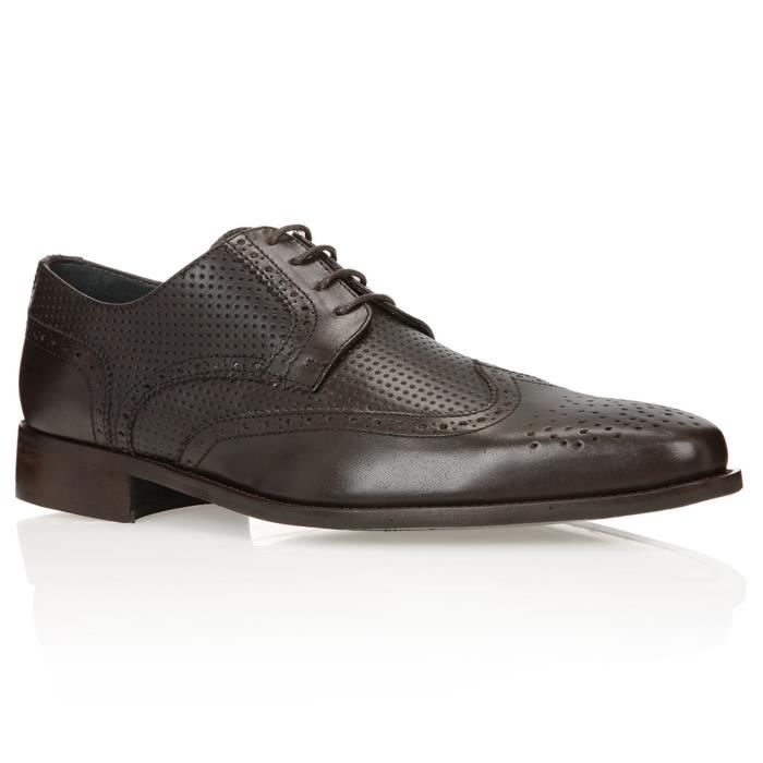 Derbies a la tige en cuir brossé avec petites perforations fantaisie, pointe étroite, coloris marron foncé. Fermeture avec cordons.