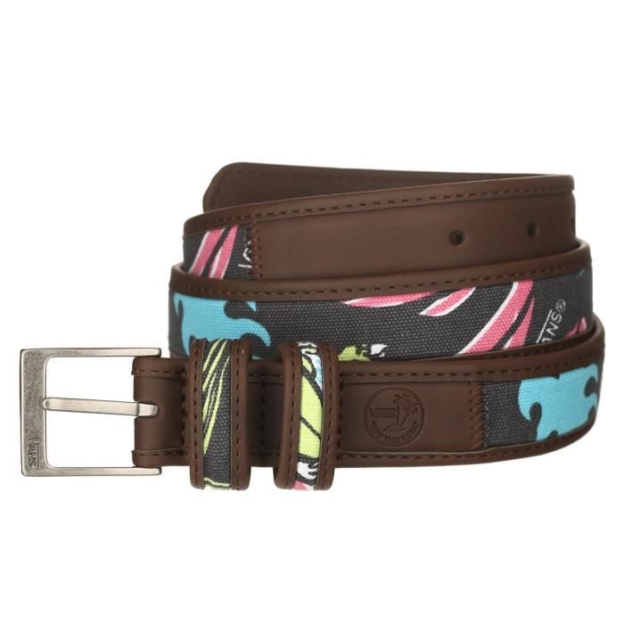 Ceinture 70 % coton, 30 % polyuréthane, marron, noir bleu et rose. Boucle a ardillon.