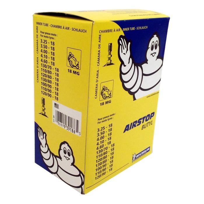 MICHELIN Chambre ? air 18MG pour moto. Dimensions : 40-46 120/90 130/70-80x18. Taille des pneus - compatibilité : 130/70-18 110/80-18 120/80-18 130/80-18 100/90-18 100/90-18 120/90-18 3.25-18 3.50-18 4,00-18 4.10-18 4.60-18.