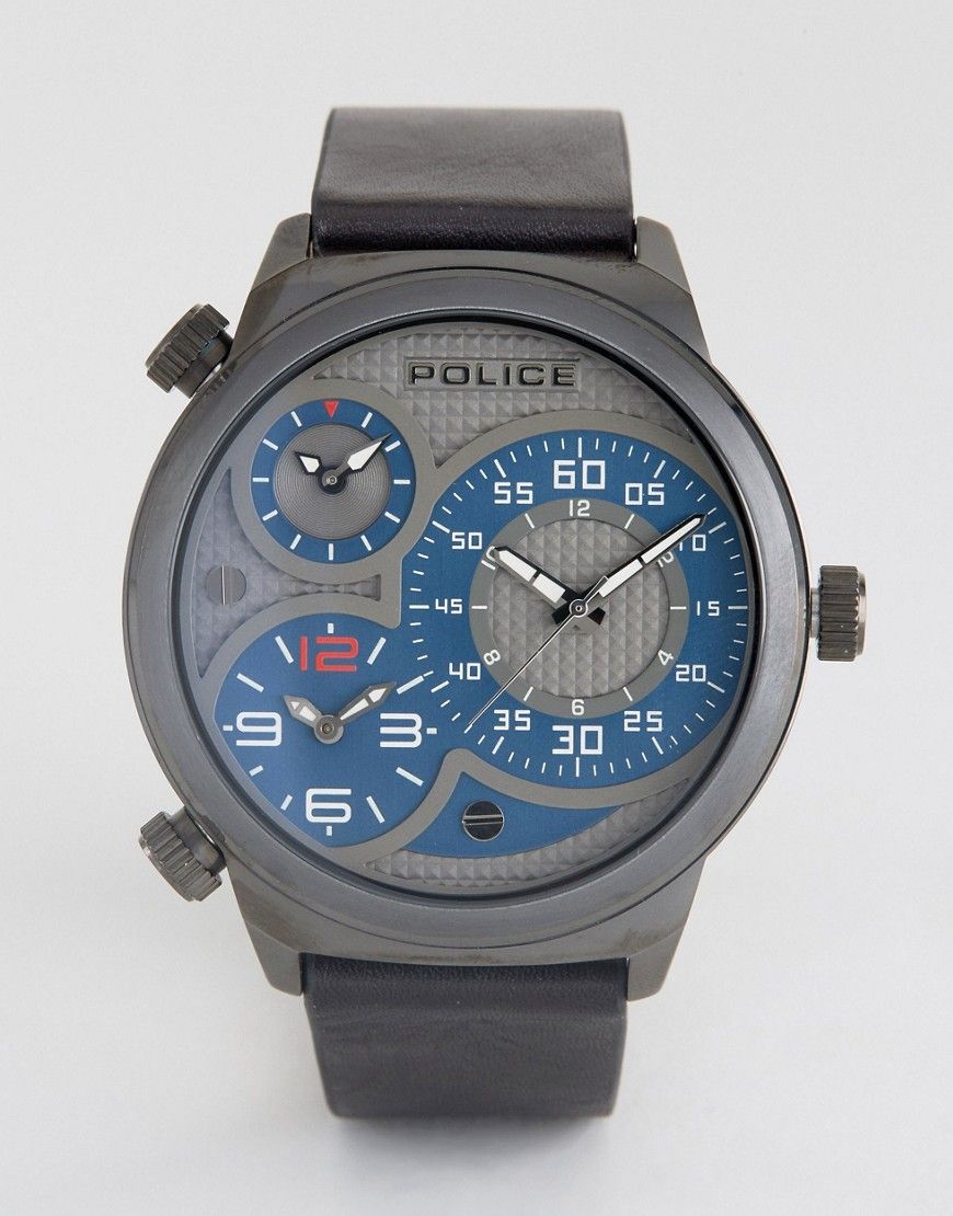 • Police - Elapid - Montre homme à bracelet cuir noir avec cadran multifonctions - Gris et bleu - Noir