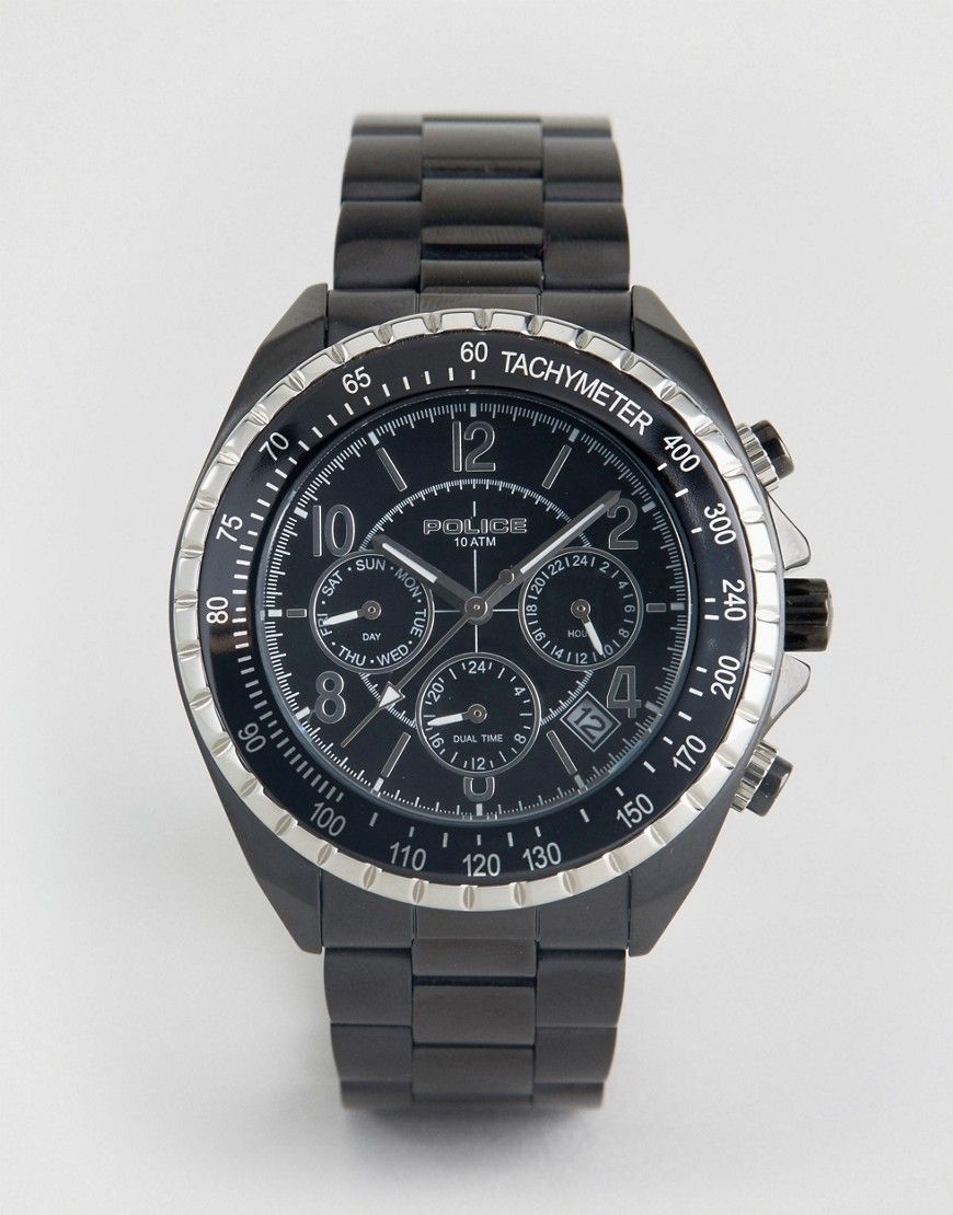Montre by Police, Bracelet, Boîtier en acier inoxydable, Mouvement à trois aiguilles, Modèle chronographe, Affichage de la date, Repères mixtes, Trois couronnes sur le côté, Fermoir dépliant, Article livré dans un coffret cadeau griffé.