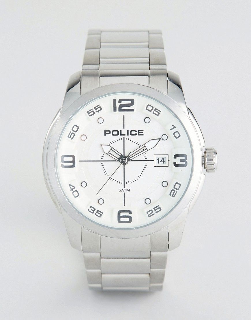 Montre by Police, Boîtier and bracelet en acier inoxydable, Mouvement à trois aiguilles, Affichage de la date, Repères chiffres, Remontoir sur un côté, Fermoir dépliant, 5 ATM : Étanche à l'eau jusqu'à 50 mètres (160 pieds