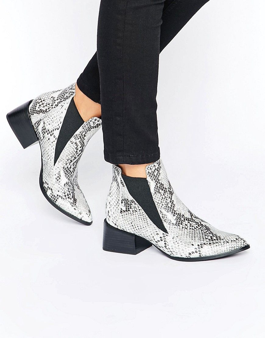 Bottines par Sol Sana, Tige en cuir à imprimà serpent, Empiècements Ãlastiques, Bout pointu, Talon mi-haut rainurÃ, Traiter avec un agent protecteur pour cuir, Tige : 100% cuir vÃritable, Talon : 5 cm (2 po). Associant l'amour du vintage de la crÃatrice Sara Caverley et les styles actuels audacieux, la marque australienne Sol Sana a Ãtà lancÃe en 2010. La marque met l'accent sur le confort et la rÃsistance, tout en se dotant des meilleurs matÃriaux ; attendez-vous à dÃcouvrir des chaussures ornÃes de barrettes, des escarpins audacieux et des bottines fabriquÃes dans des cuirs de haute qualitÃ.