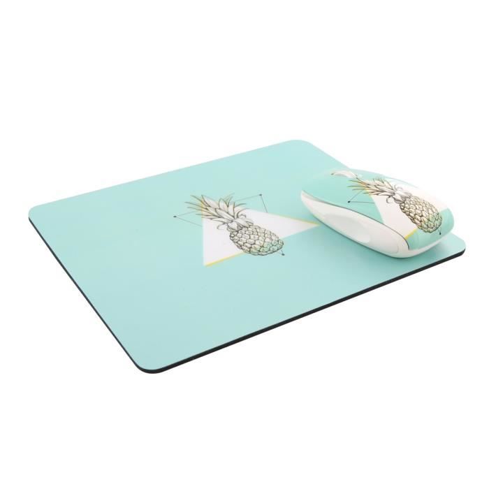 Ensemble souris sans fil et tapis de souris Ananas - Souris sans fil design et compacte - 2 boutons & scroll cliquable - 1000 dpi - Tapis souris ultra fin anti-dérapant - Précision et efficacité - Longue durée - Compatibilité : PC / Mac / Linux - Connectivité : USB - Epaisseur : 3mm - Technologie capteur : Optique - Garantie 1 an - Couleur : Ananas