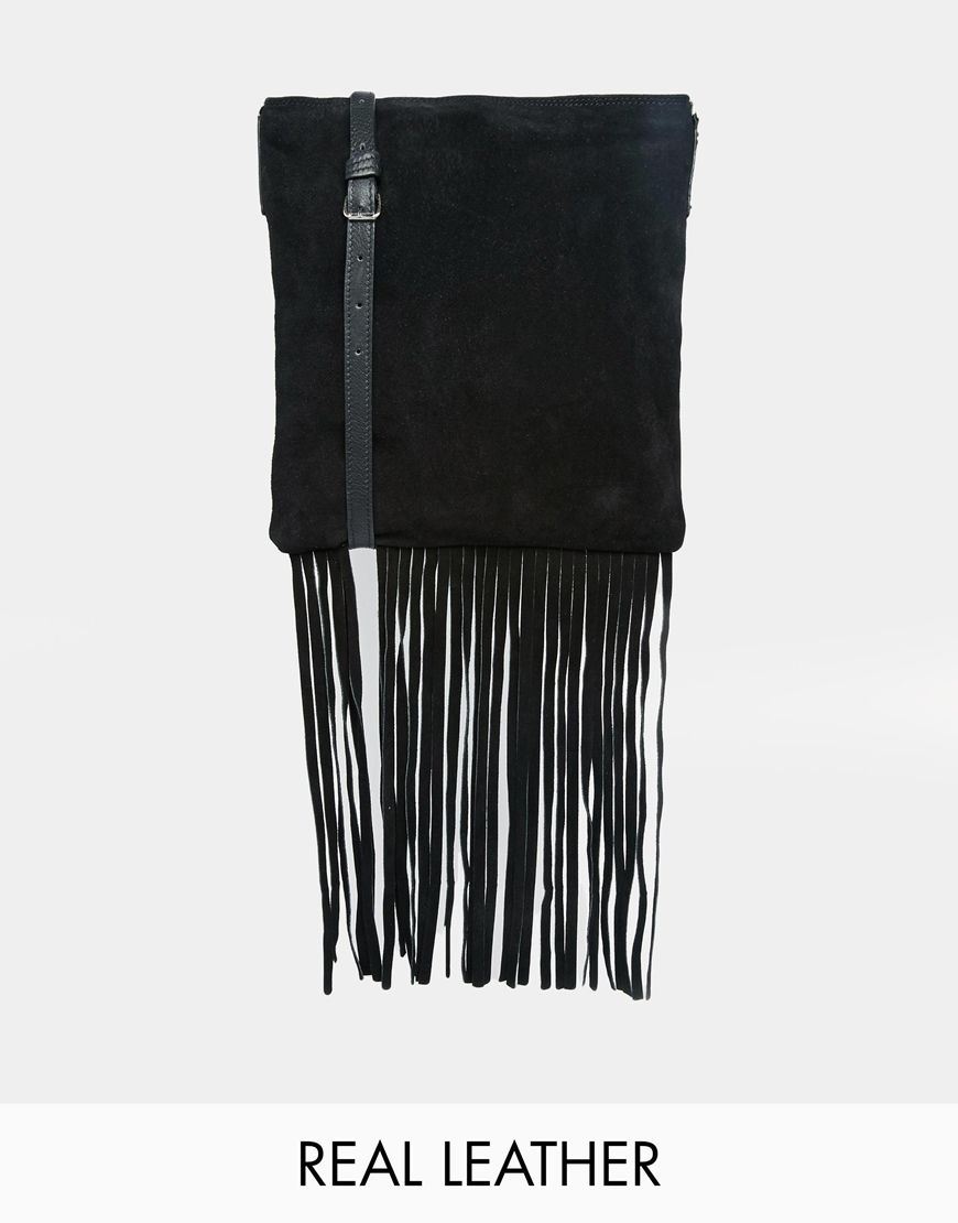 ASOS Leather And Suede Festival Fringed Cross Body Bag - Noir