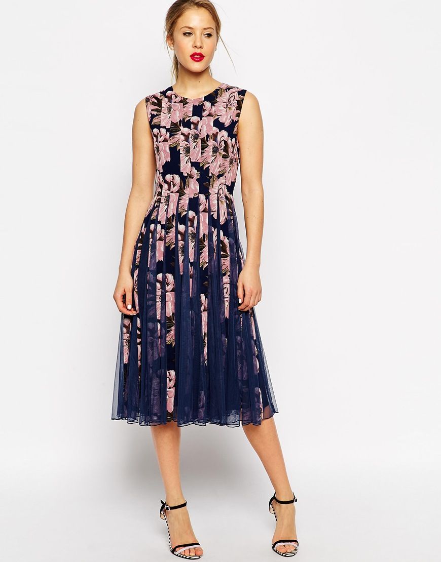 • ASOS - Robe ajustée mi-longue à bas évasé et empiècements en tulle fleuri - Imprimé marine