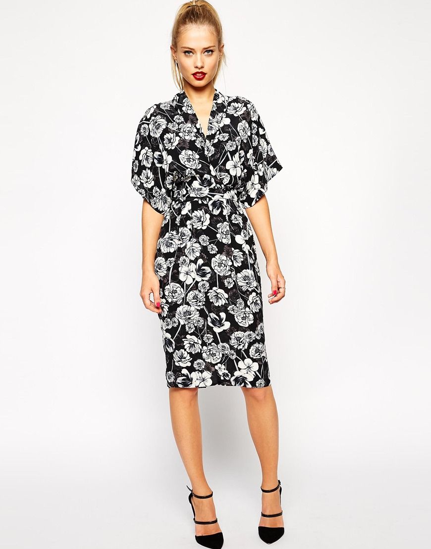 ASOS - Robe cache-cœur style kimono à imprimé fleuri - Noir et blanc - Imprimer