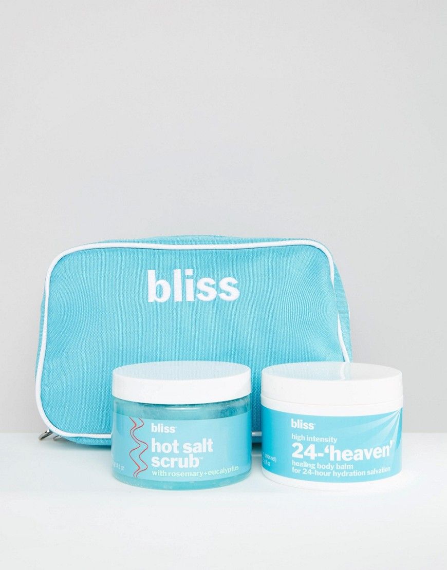 Soin de la peau par Bliss Duo de soins super adoucissants et réparateurs pour le corps Gommage au sel pour le corps Gommage pour le corps avec un parfum tonifiant aux plantes Contient un sel de mer auto-chauffant qui exfolie tandis que le romarin et l'eucalyptus stimulent vos sens. Baume réparateur pour le corps 24 'heaven' Crème réparatrice pour les peaux déshydratées et abîmées Hydratation de la peau pendant 24 heures Livrées dans un étui griffé