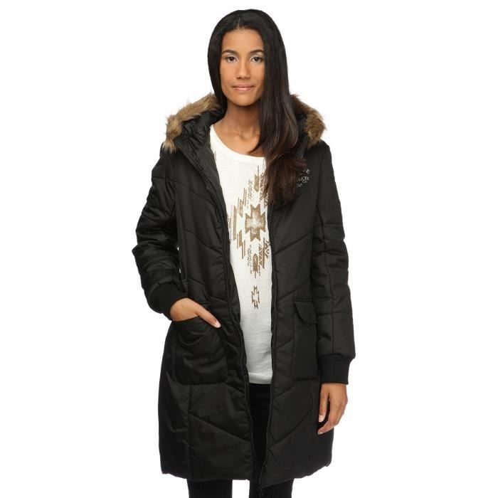 Manteau noir, col capuche avec bord en fausse fourure, manches longues, fermeture zippée. Coupe droite