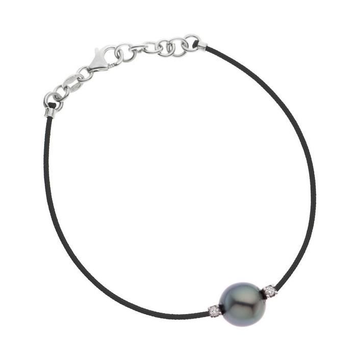 Bracelet en argent 925/1000 et lien nylon torsadé de coloris noir orné d'une véritable perle de culture de Tahiti. Perle ronde de 8-9 mm de diametre entourée de deux diamants pour un poids total de 0,06 cts. Poids moyen de l'argent : 1,5 gr.