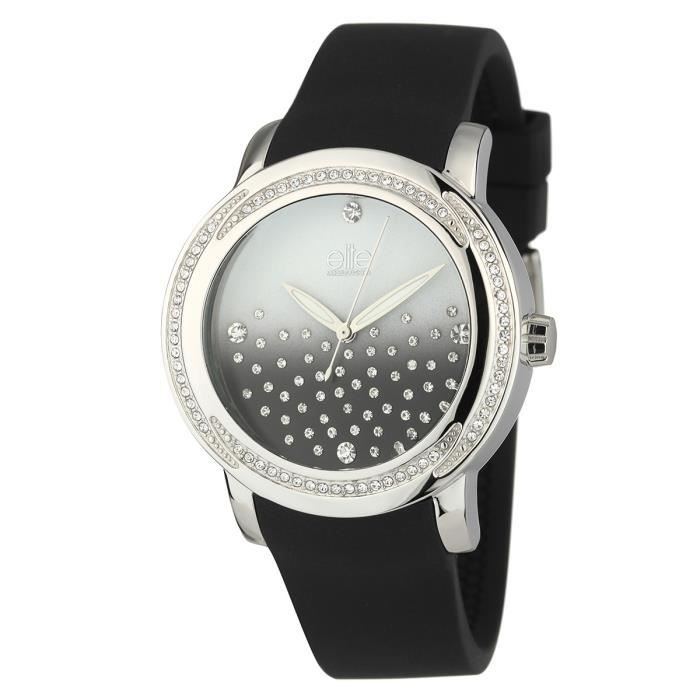 Montre en acier sur bracelet en silicone noir. Lunette sertie de strass. Cadran gris doté d'un affichage analogique. Mouvement quartz. Montre résistant a une pression de 3 ATM.