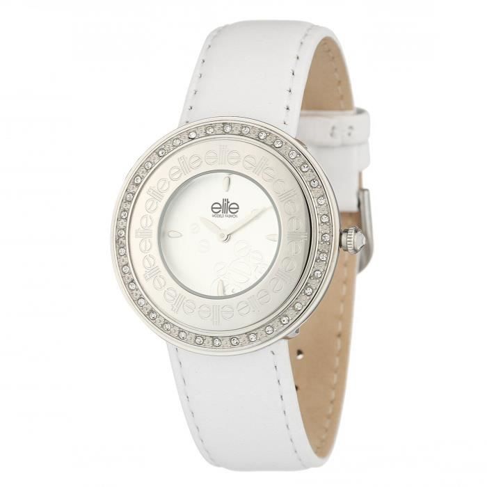 Montre en acier sur bracelet en cuir blanc. Lunette sertie de strass. Cadran blanc doté d'un affichage analogique. Montre résistant a une pression de 3 ATM.