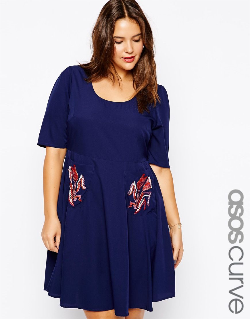 • Exclusivité ASOS CURVE - Robe patineuse mi-longue avec poches brodées - Bleu marine
