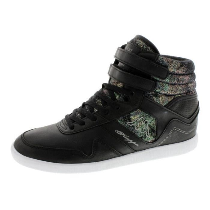Baskets montantes en synthétique avec empiecements irisés, coloris noir. Fermeture a lacets et bandes scratchées.