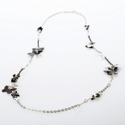 Superbe sautoir surmonté de papillons argentés et de papillons noirs, de perles fan...