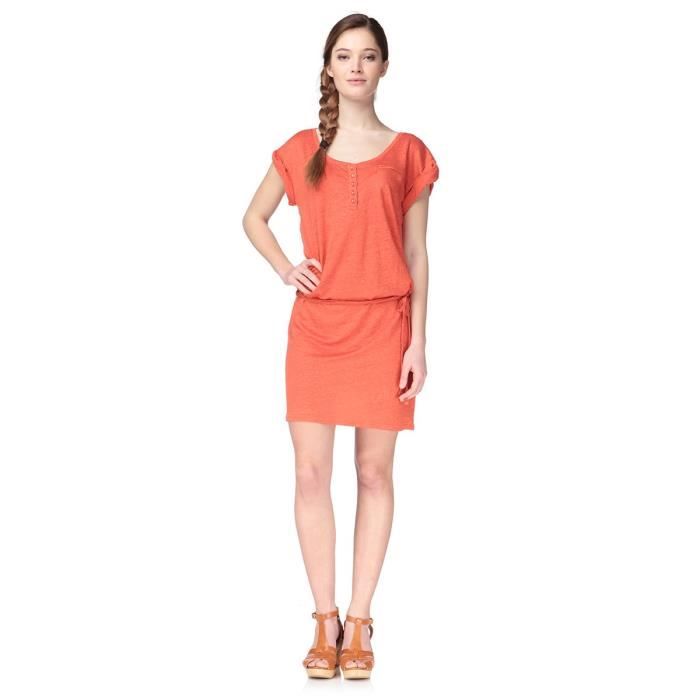 Robe col arrondi, 100 % lin, corail. Boutons, manches courtes, ceinture a nouer