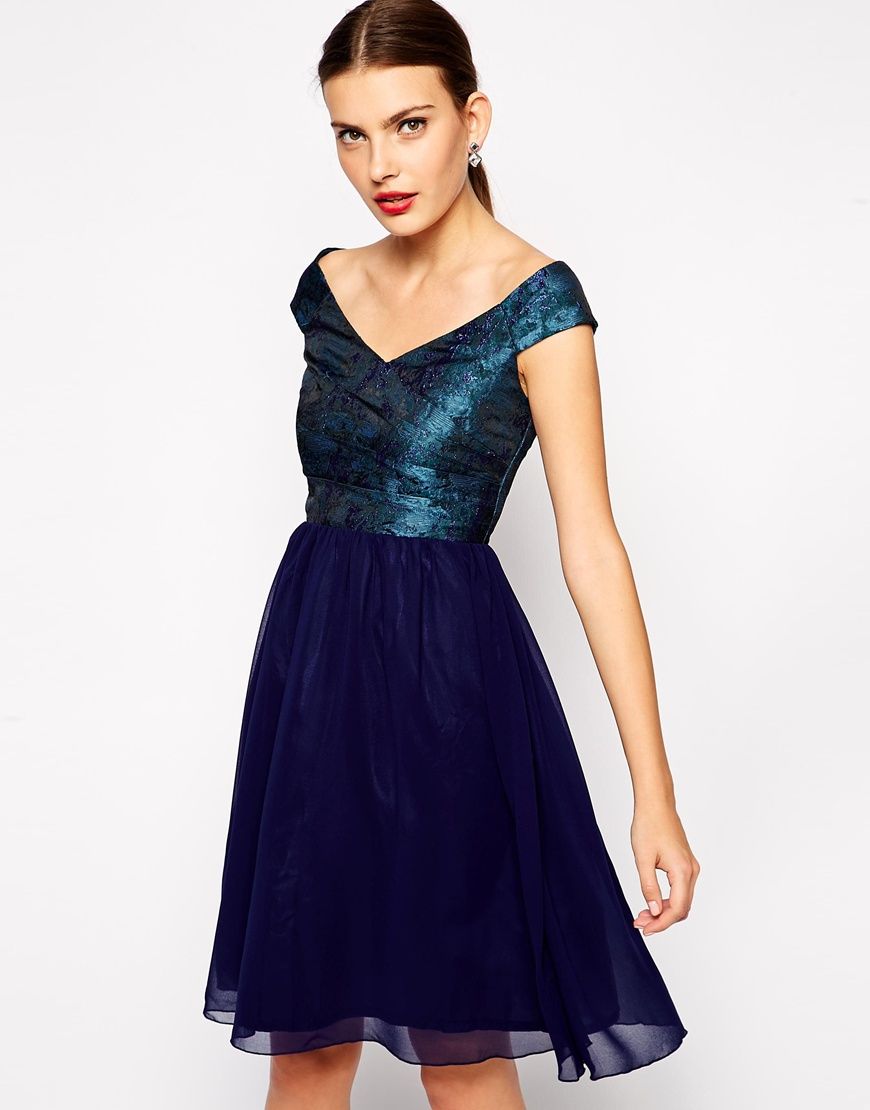 • Little Mistress - Robe de bal de fin d'année babydoll style Bardot avec corsage en jacquard métallisé - Multi