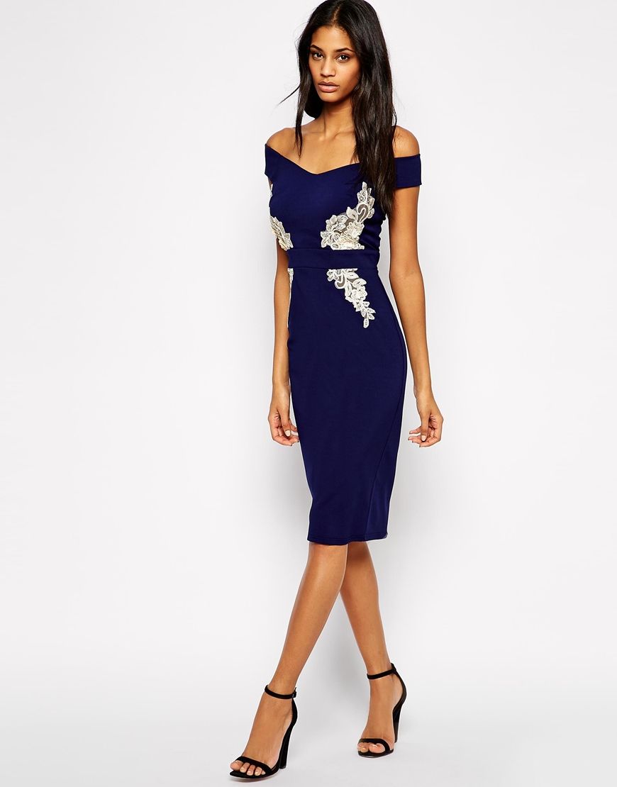 Little Mistress - Robe fourreau à épaules dénudées et fleurs appliquées en 3D - Bleu marine