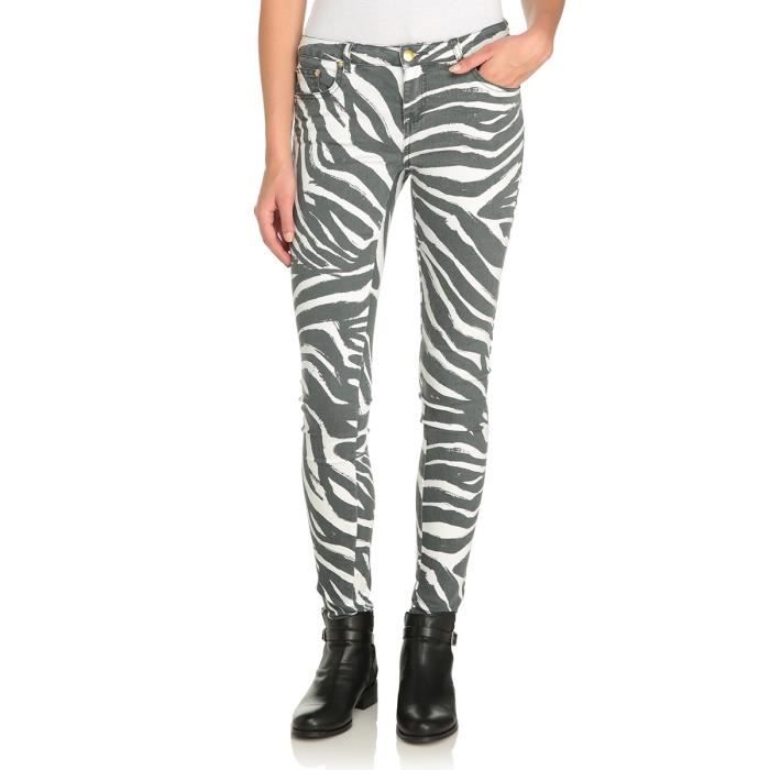 Gris et blanc imprimé zebre. Pantalon coton/polyester/élasthanne, bouton. Pantalon 5 poches.