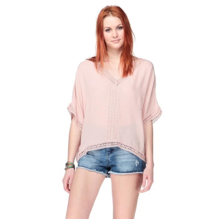 Top col V, 100 % coton, rose poudré. Manches 3/4 kimono, découpes en crochet, cordon a nouer au dos.