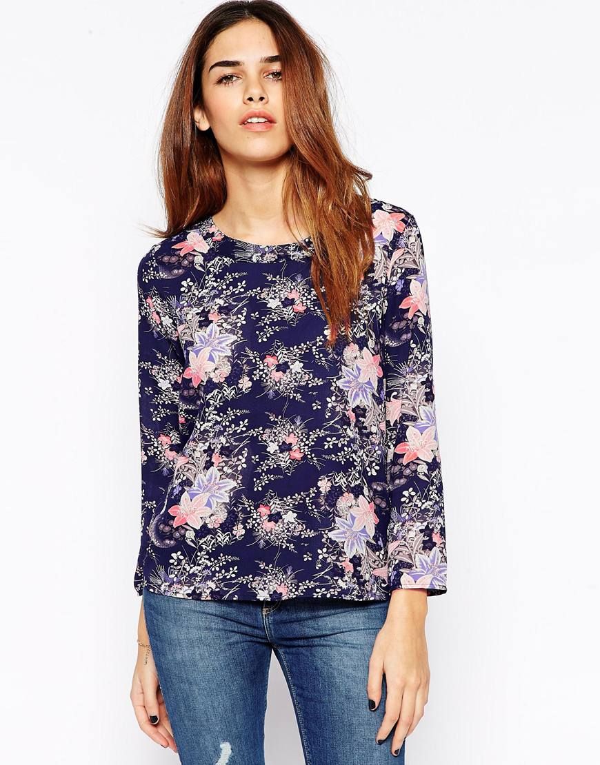 • Only - Top fleur coupe carrée à manches longues - Bleu indigo
