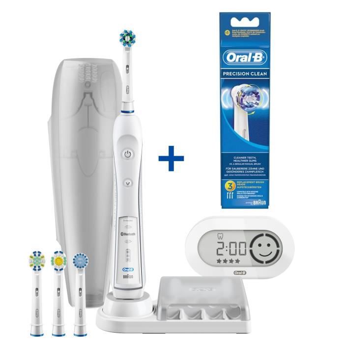 Brosse a dent électrique - Technologie Pro Cross Action - 8800 mouvements/min - 5 Modes de brossage - 4 brossettes : Crossaction, sensitive, 3D White, FlossAction - Minuteur professionnel - Base de chargement avec rangement - Indicateur lumineux de pression - Connectivité Bluetooth - Etui + 3 Brossettes Precision Clean